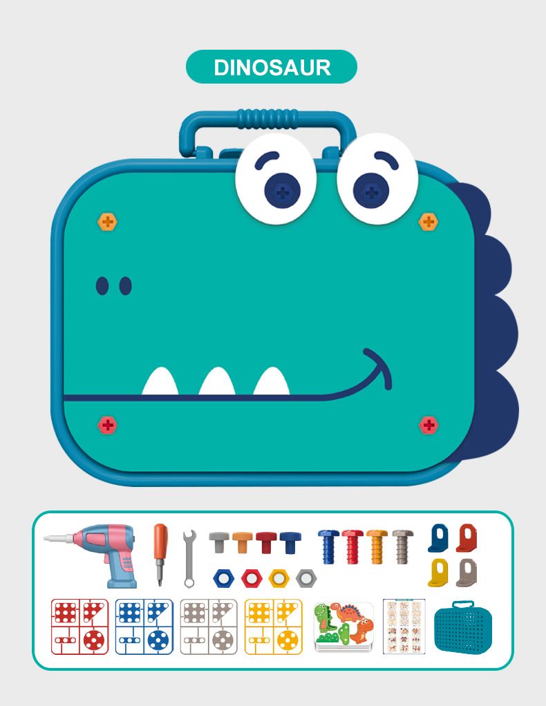Build, drill, and create with this dinosaur-themed STEM toy! Includes a dino-shaped carry case, child-safe electric drill, wrench, colorful screws, and design plates for hours of hands-on learning.