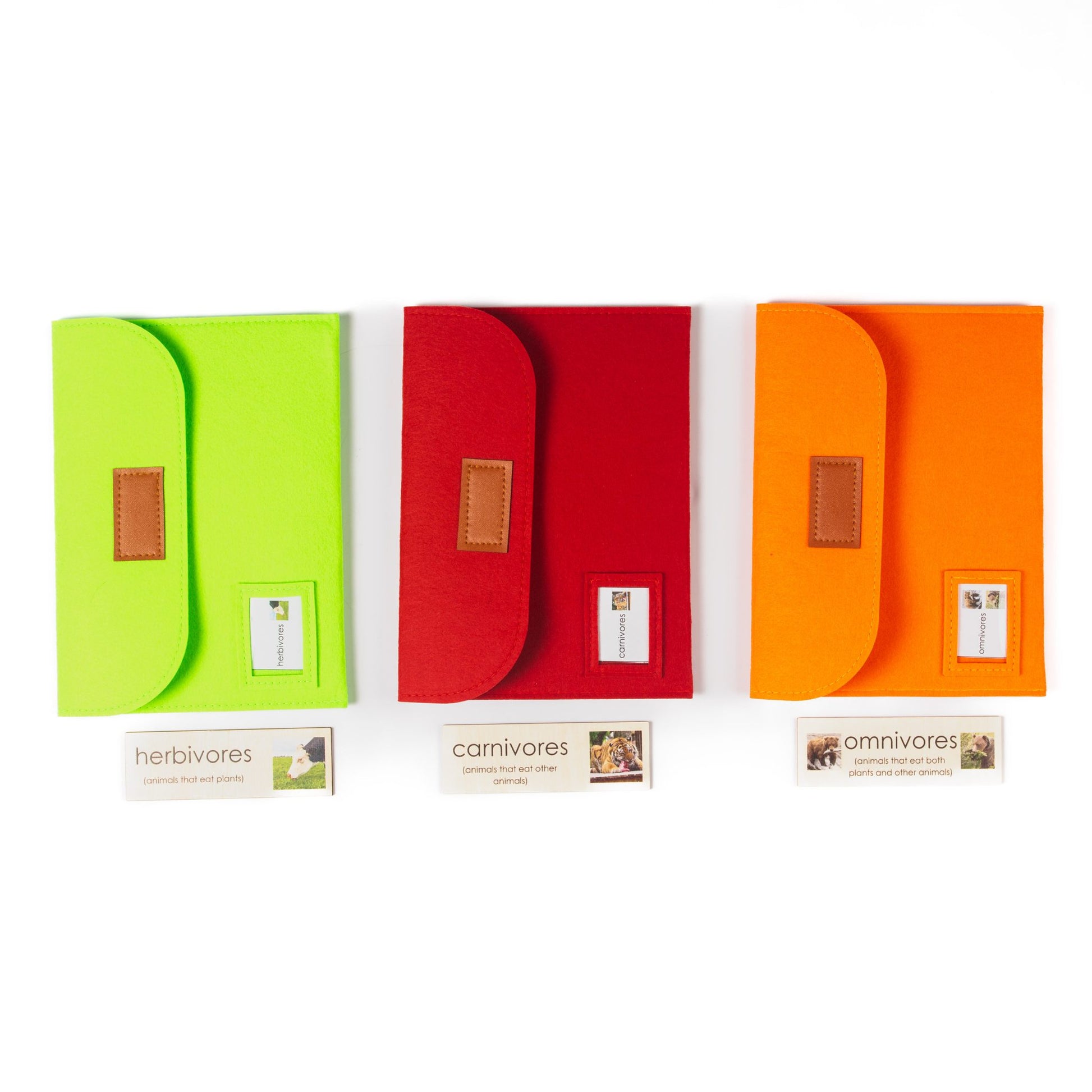 Present the three wooden title cards and corresponding felt pouches. Invite the child to observe each animal card and classify it by diet—herbivore, carnivore, or omnivore—placing it in the matching pouch. For enrichment, pair with realistic animal figurines or use during group zoology lessons.
