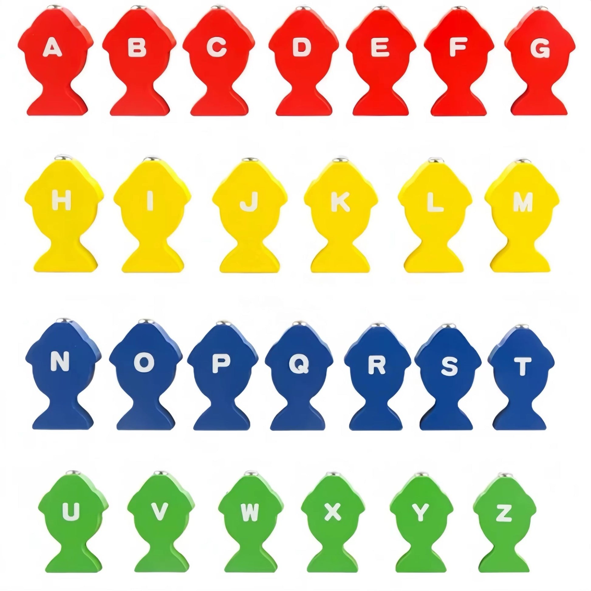 Children use the magnetic rod to catch colorful alphabet fish, building familiarity with letters while strengthening hand-eye coordination and fine motor control. The bead sorting activity helps kids recognize colors, sort objects, and follow visual patterns using included cards.