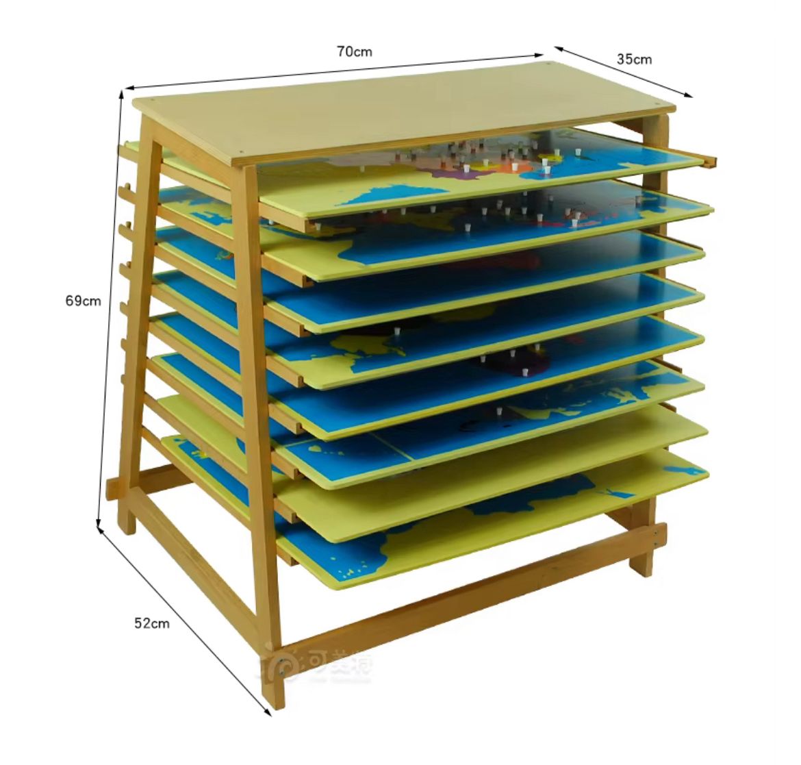 A sturdy wooden cabinet designed to neatly store up to 8 Montessori puzzle maps. Ideal for geography shelf organization in classrooms or homeschool settings.