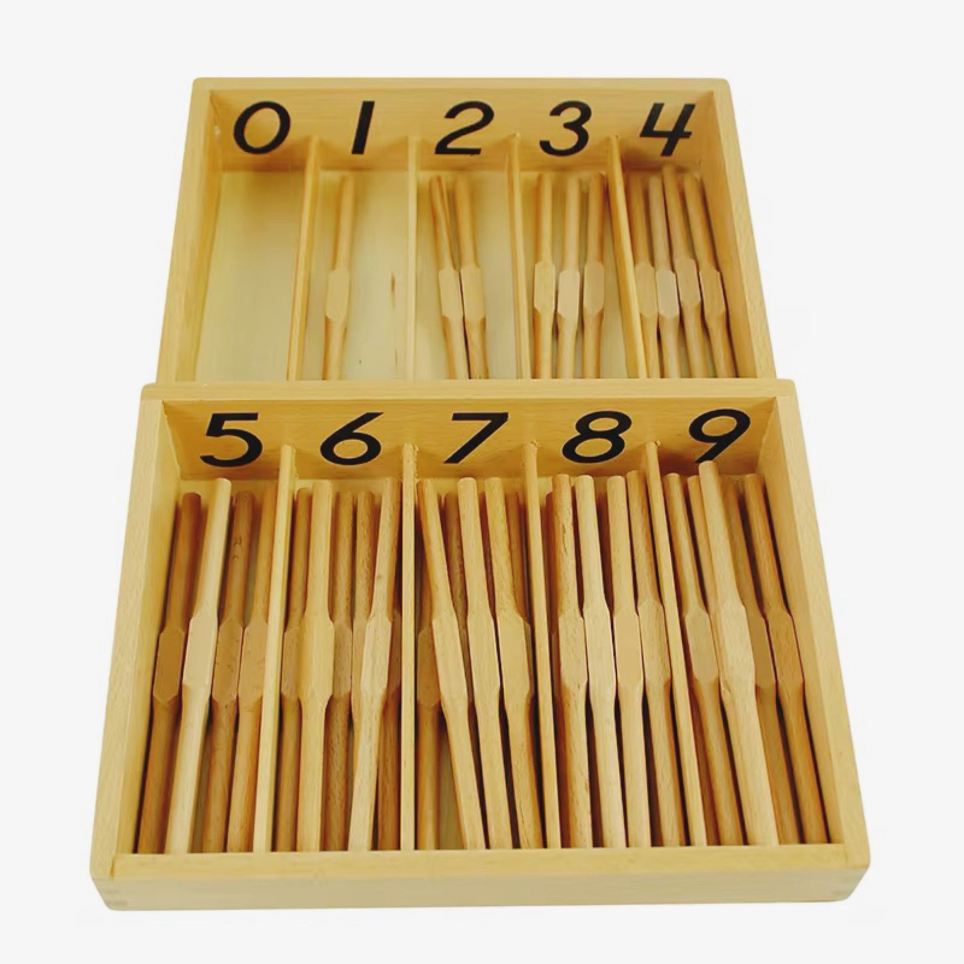 • 2 wooden spindle boxes with printed numerals (0–9)