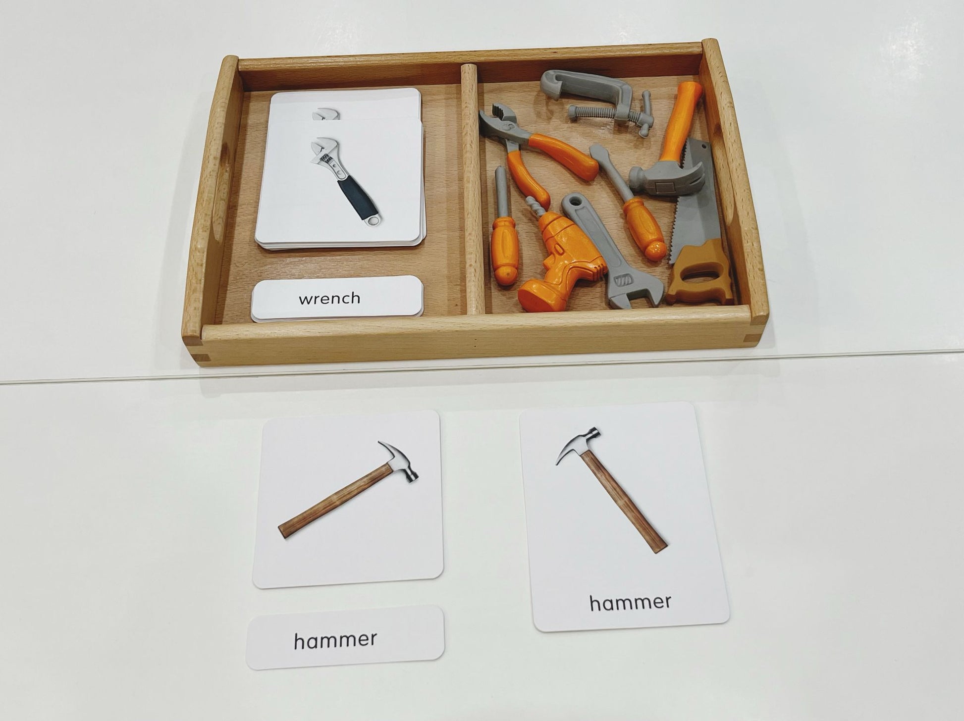 This Montessori Tools Nomenclature Set includes eight miniature tool figurines with corresponding 3-part cards. Great for early vocabulary, classification activities, and Montessori-inspired learning.