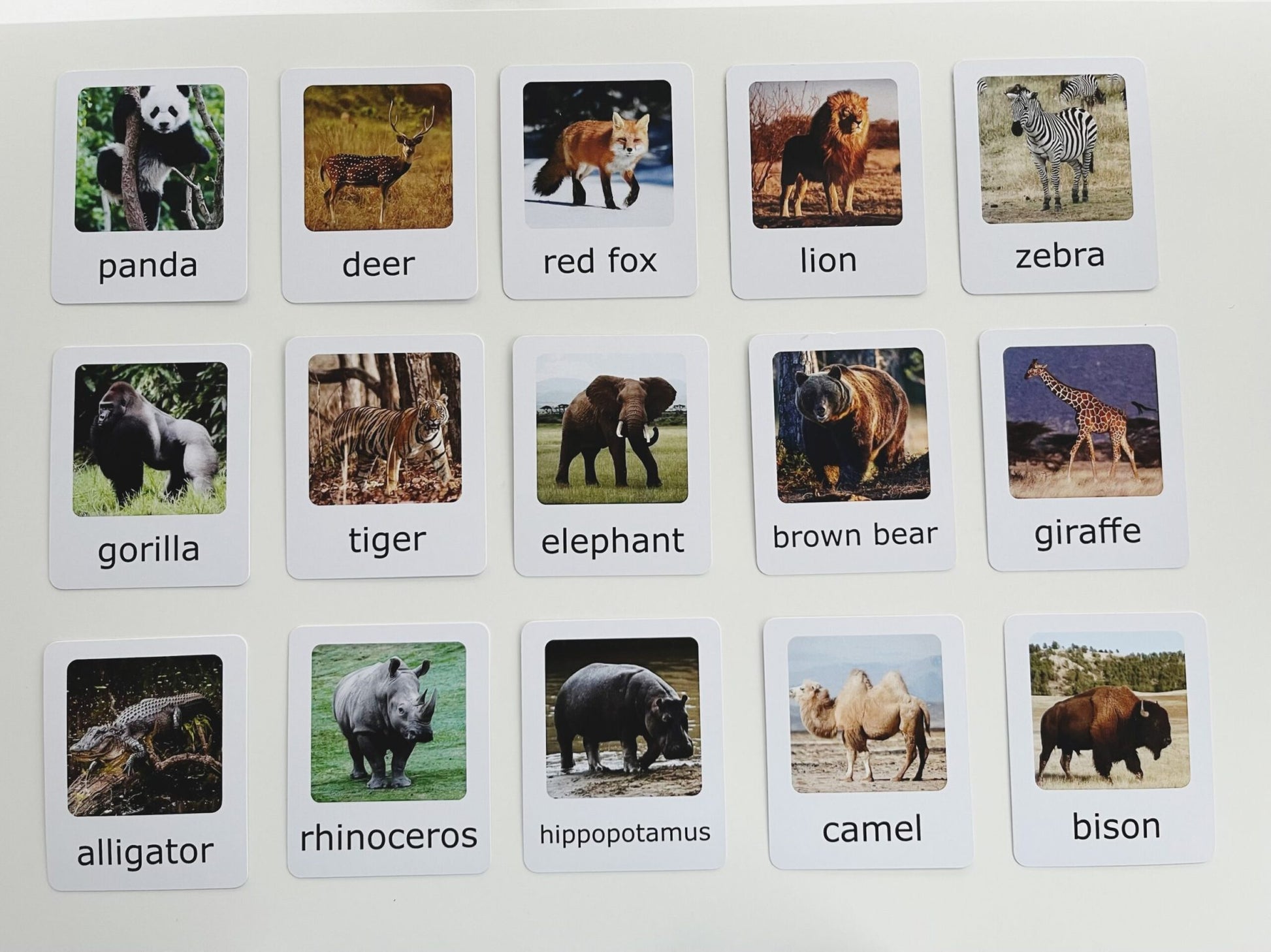 A Montessori wild animals material featuring 15 realistic figurines with matching cards. Supports animal classification, habitat learning, and zoology shelf work.