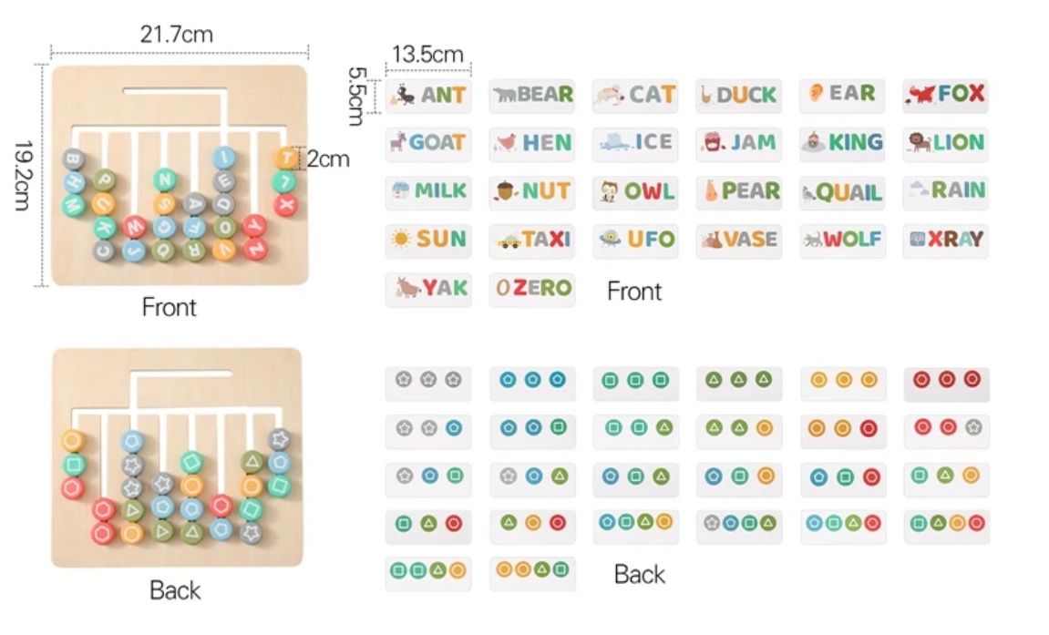 Support early childhood development with this Montessori Wooden Alphabet and Pattern Matching Board, a versatile and interactive learning toy designed for toddlers and preschoolers. One side features 26 colorful alphabet beads that match with corresponding cards, helping children learn letter recognition, phonics, and basic word formation.