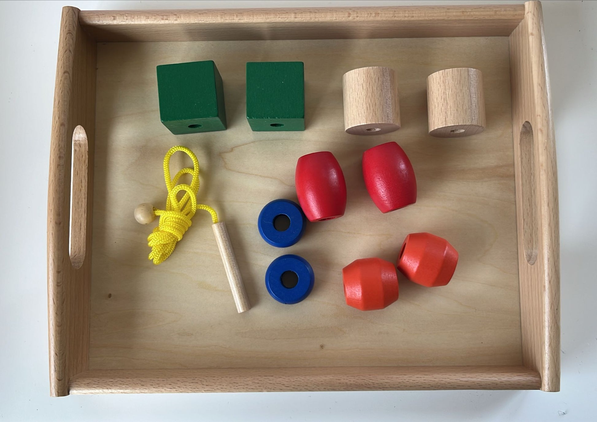 Montessori practical life material with wooden lacing beads in multiple shapes. Includes threading tool and cord. Builds fine motor control, coordination, and independence.