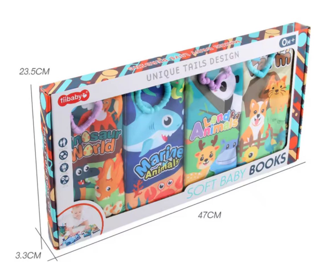 Explore textures and tails with this 4-in-1 set of sensory cloth baby books. Designed for little hands and curious minds, each book features vibrant animal themes to support early learning through touch, sight, and play.