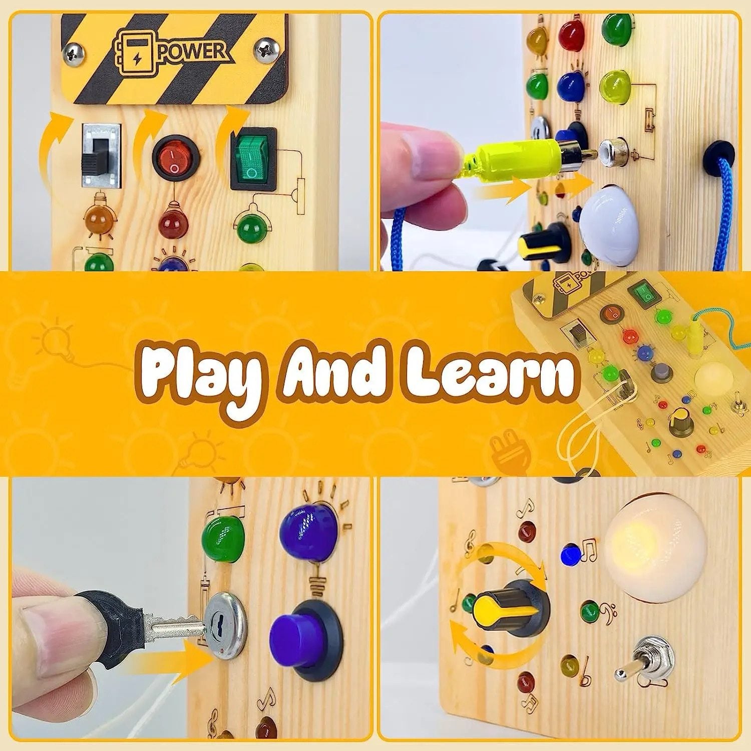 - 1 wooden busy board with pre-installed switches, knobs, and lights